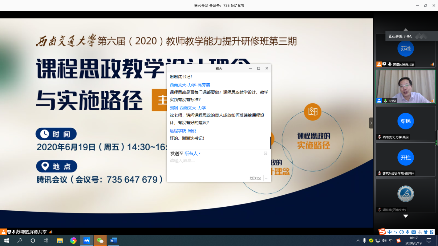 力学与工程学院2020年第5次中心组专题学习于6月19日14:30开展,本次学习采取的是“腾讯会议” 视频形式,学习专题为“课程思政的内涵、教学设计与实施路径”, 主讲人为素人AV