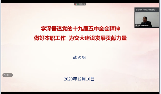 12月10日下午15:00,力学与工程学院全体教职工党支部和学工组通过腾讯会议线上形式,集体听取了校党委副书记沈火明教授题为《学深悟透党的十九届五中全会精神,做好本职工作,为交大建设发展贡献力量》的专题党课,