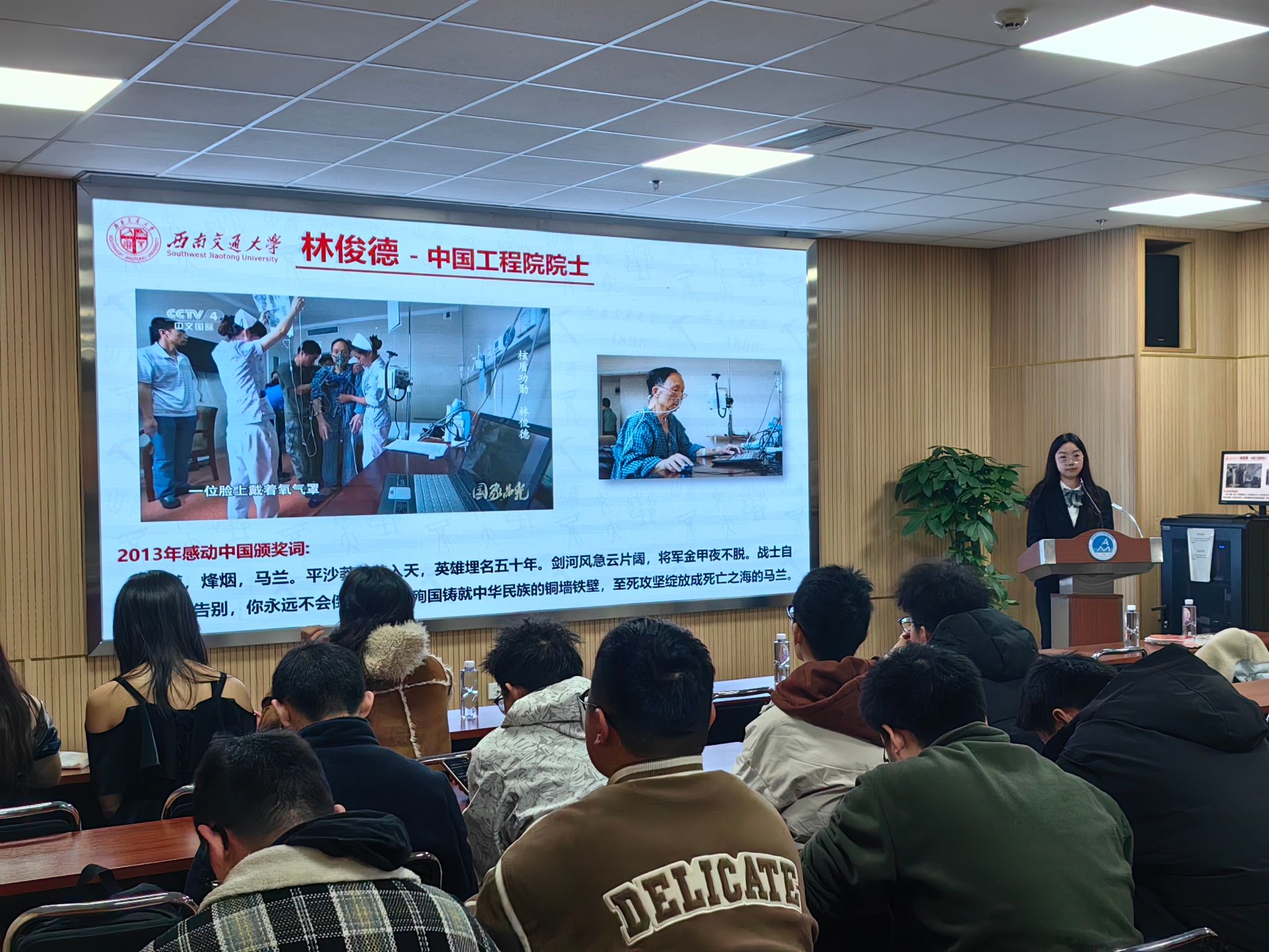 活动第二项,学生讲解员娓娓道来科学家的故事。他们还原了郭永怀归国时撕毁手稿的细节:“在罗湖桥头,他把所有研究数据一张张烧毁,火光中映出的是科学家的赤胆忠心”;当讲到郭永怀牺牲前用身体护住公文包时,现场响起经久不息的掌声;当讲述起林俊德在病房里依旧兢兢业业工作,大屏幕定格在生命监护仪曲线变成直线的那张照片时,许多同学默默擦拭泪水;当展示到茅以升先生晚年重访钱塘江大桥的照片时,历史与现实交织的厚重感让全场肃然。