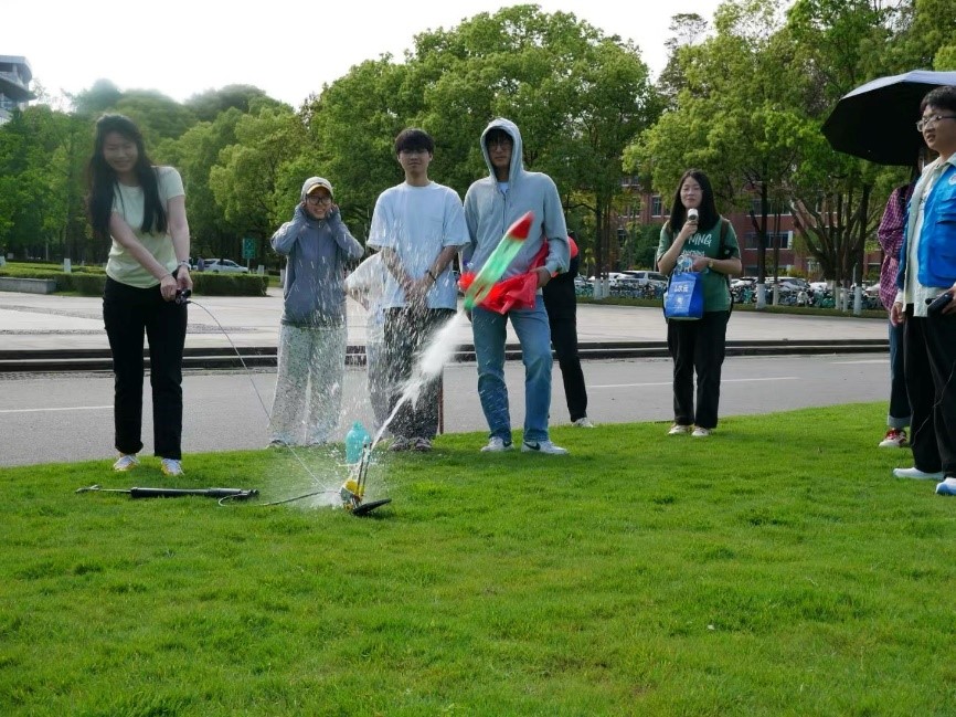 接下来,同学们移步交大校园,在开阔的校园草坪上体验水火箭项目,并参观交大南门、竢实扬华墙、张维雕像、素人AV