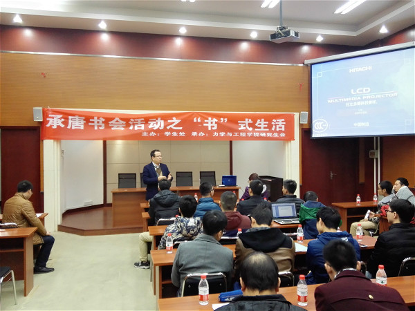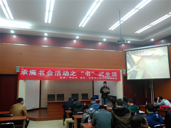 12月8日下午16时,力学院承唐书会活动之“书”式生活在九里校区行政楼力学学院学术报告厅顺利举行。活动邀请到力学院党委副书记张军琪老师,研究生辅导员刘青老师莅临指导。研究生会成员及部分研一新生和本科生参加了本次活动。
