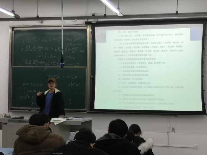 学生纪律处分规定(试行)》,告诫同学们不能触碰纪律红线,无论考试、学习还是做人,诚实守信是十分重要的品质。如果考试期间不诚实,不仅会受到纪律处分,同时对别的同学来说不公平,更重要的是损害了个人品质,也达不到考试本来的目的,可谓百害而无一利;第二,杨老师围绕防火防盗防骗防踩踏、宿舍安全、人身安全以及财产安全等安全问题进行强化教育。提醒同学们即将到来的元旦假期尽量不要到人多的地方凑热闹,多利用假期加强复习;冬季天气寒冷,但坚决不能再宿舍使用违章电器,威胁大家的人身安全;妥善管理自己的财物,注意防骗防盗,尤其不能碰网络借贷;注意出行安全,及时防范、远离危险等。