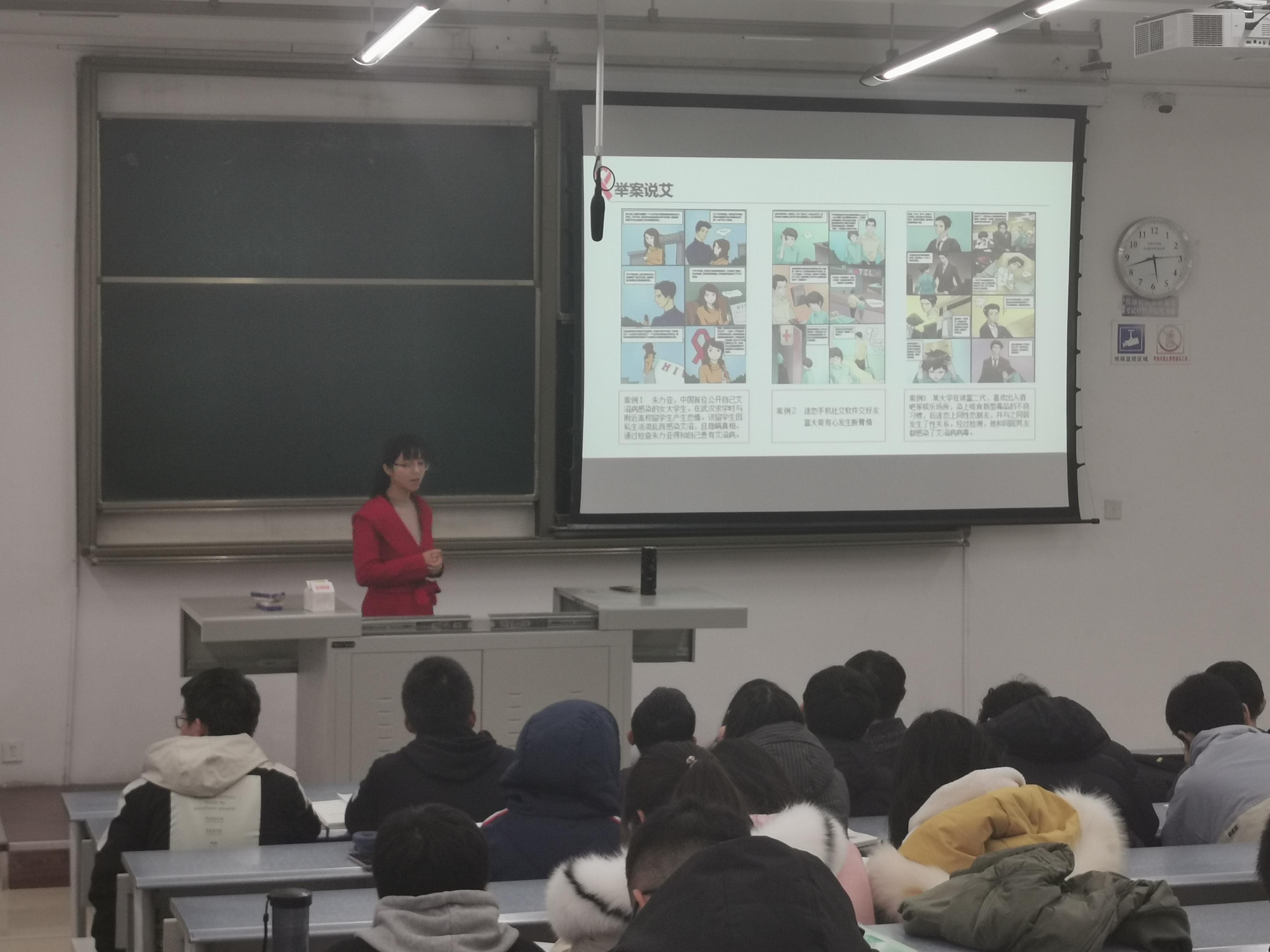 杨婧老师给同学们讲解了什么是艾滋病、艾滋病的感染途径以及预防艾滋病的有效方式,在讲座中,杨老师还通过案例,告诫大家近年来在学校中,学生的艾滋病疫情上升较快,30岁以下青少年人群成为“重灾区”,要求同学们要提高自我保护意识,重视艾滋病的预防。