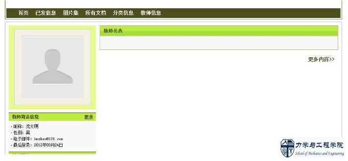 学院教师中心已开通,并逐渐更新,如需浏览某位教师发布信息,请在 师资队伍 栏目中点击对应教师信息~