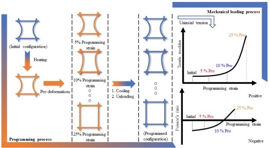 鉴于此,我们考虑热-机械历史对基体材料力学性能的影响,通过系统的实验与有限元分析,详细讨论了在不同编程应变下编程态点阵结构拉伸模量、泊松比的转变。同时,结合有限元模型对编程态点阵结构的变形行为进行分析,阐明了结构性能转变机理,为性能可调控结构设计与优化进一步提供了参考。