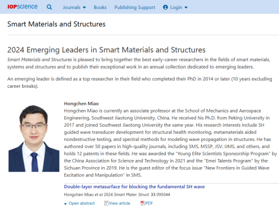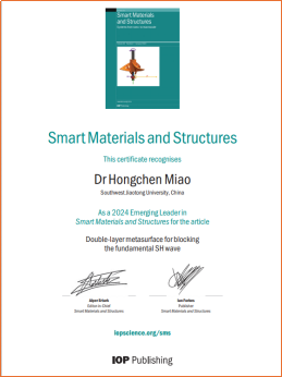 苗鸿臣副教授因其在水平剪切波可控激励与可控传播及工程应用方面的杰出贡献,获得2024年的Smart Materials and Structures Emerging Leader奖。