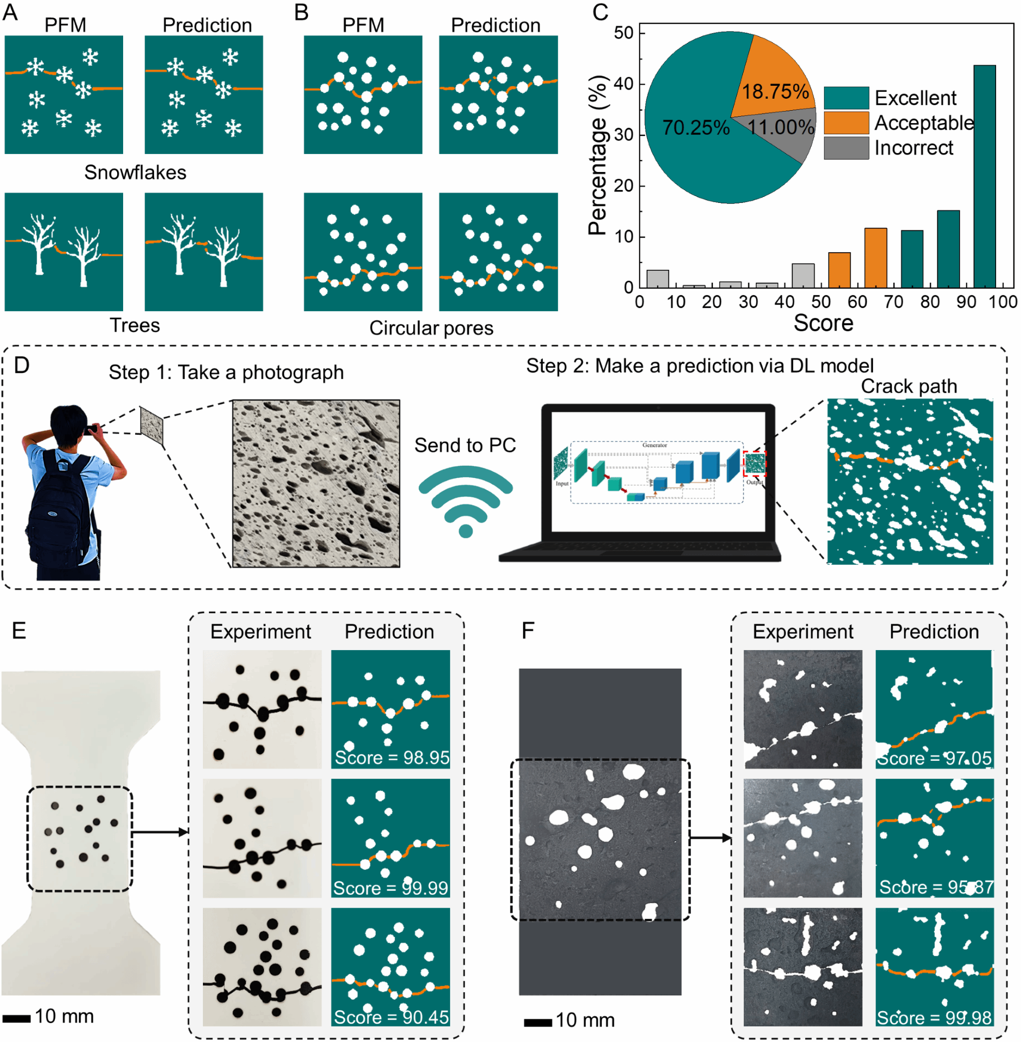 图4. 深度学习模型的泛化能力和应用测试:(A)对定制多孔图案(“雪花”和“树从”)裂纹路径的预测;(B)对随机分布圆形孔隙的多孔板的代表性预测。训练数据由具有不规则随机孔隙的多孔板组成,而测试样本则具有圆形孔隙;(C)预测裂缝路径相关分数的统计结果;(D)根据照片直接预测多孔板裂纹路径的流程图;(E)具有随机分布的圆形孔隙的陶瓷片。裂纹路径由深度学习模型和实验预测获得;(F)具有天然多孔结构的多孔玄武岩板的断裂实验结果和深度学习预测结果。