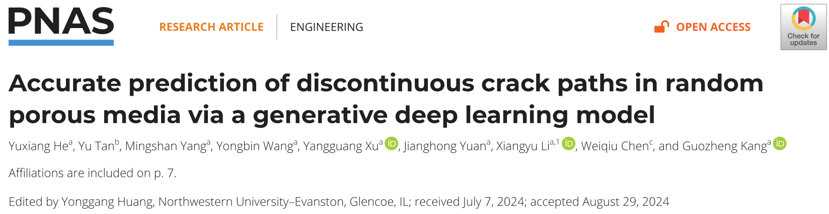 博士研究生贺宇翔在《美国科学院刊》(Proceedings of the National Academy of Sciences of the United States of America, PNAS)上发表题为 “Accurate prediction of discontinuous crack paths in random porous media via a generative deep learning model”的研究论文。PNAS创刊于1914年,被公认为四大名刊之一(Nature、Science、Cell、PNAS),是被引用次数最多的综合学科文献之一。素人AV