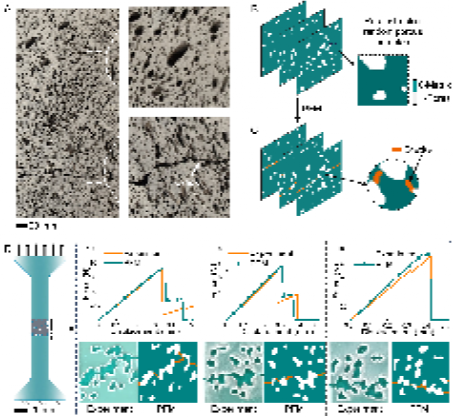 图2. 随机多孔介质的断裂:(A)多孔玄武岩的气孔结构;(B)根据玄武岩的多孔结构重建的随机多孔介质模型;(C)通过相场断裂模型(PFM)计算获得随机多孔介质的断裂路径;(D)多孔聚甲基丙烯酸甲酯(PMMA)薄板的断裂实验。