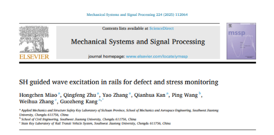 康国政教授团队在钢轨导波监测领域取得重要进展,相关成果以“SH guided wave excitation in rails for defect and stress monitoring”为题发表在工程动力学领域顶级期刊《Mechanical Systems and Signal Processing》(中科院一区,IF: 7.9)。论文第一作者是康国政教授团队波动力学与结构健康监测研究小组负责人苗鸿臣副教授,康国政教授为论文的通讯作者,合作者还包括素人AV