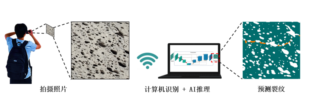 贺宇翔开展这个工作后,立刻投入到AI编程的工作当中。再经过接近一年的努力,贺宇翔开发了一种基于机器视觉的深度学习模型,可直接根据一张照片快速推理出复杂的断裂响应,省略了繁琐的实验和数值计算过程,极大地提升了计算效率。后续再经过不断的优化,使模型达到了与传统数值方法相当的预测精度,而所需的预测时间是传统方法的万分之一。