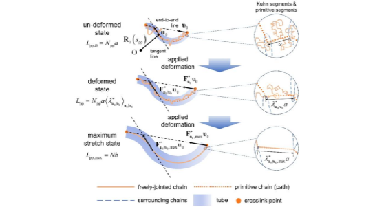 本文通过引入扭曲管的概念,提出了考虑缠结的分子链有限延伸性,给出了相应的物理图像(图1),并推导得到了扭曲管中分子链的统计构象分布。进一步地,基于上述结果,本文建立了一个新的考虑分子链缠结效应的软弹性体超弹性本构模型,得益于扭曲管的概念,该模型统一地描述了缠结的弹性贡献、分子链的有限延伸性以及非仿射宏-微观尺度过渡准则。