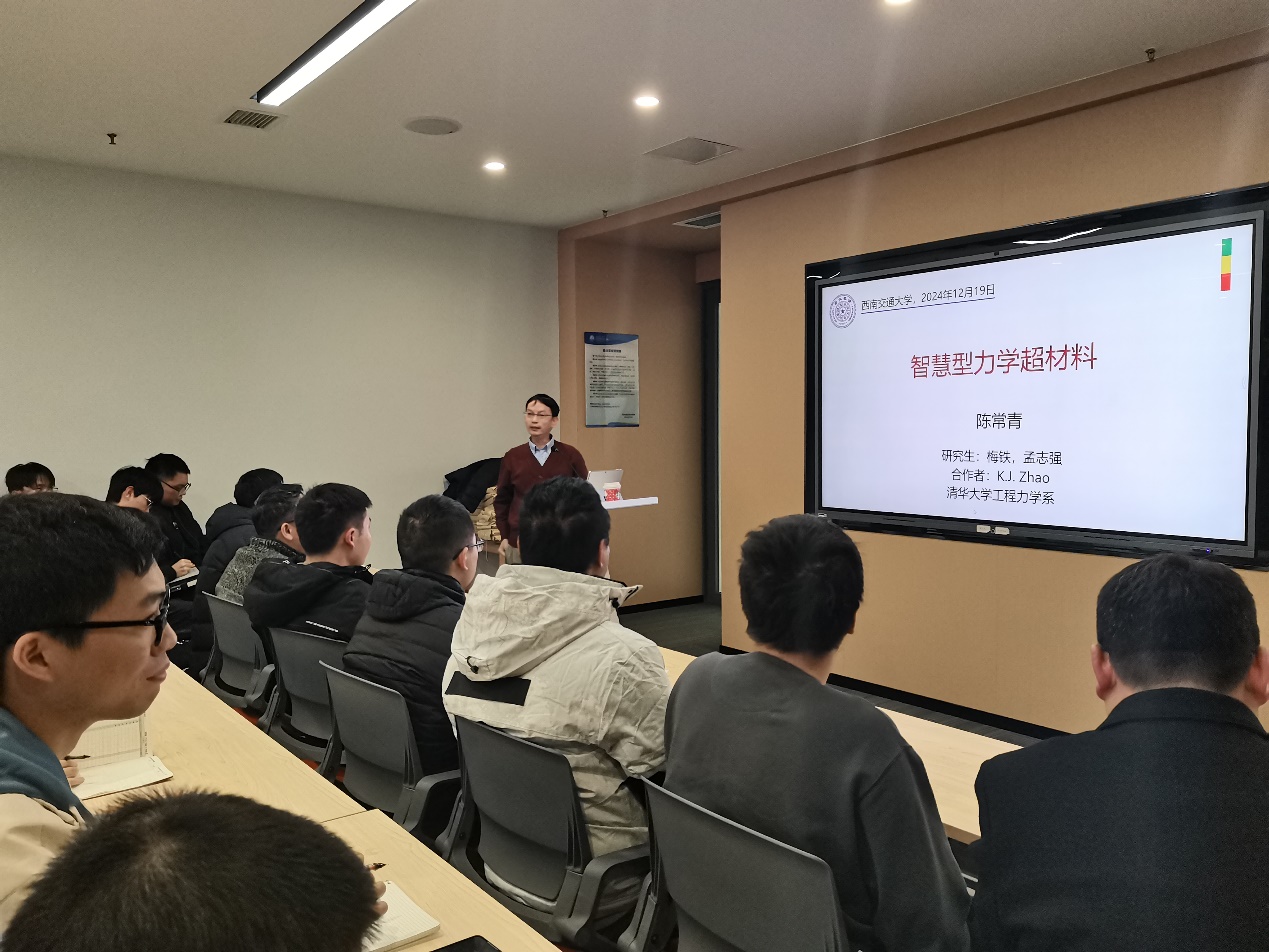犀浦校区X30280会议室迎来了一场关于智慧型力学超材料的精彩讲座。本次讲座由清华大学工程力学系主任、钱学森力学班执行首席教授陈常青主讲,吸引了众多师生前来聆听。陈教授不仅是国家级高层次人才计划的入选者,还在多功能材料与结构力学领域取得了卓越成就,拥有10余项发明专利,并在JMPS、Nature Communications、Science Advances等国际知名期刊上发表了150余篇学术论文。陈教授以其深厚的学术底蕴和前沿的研究视角,为大家带来了一场别开生面的学术盛宴。