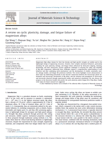 康国政教授团队在国际知名期刊《Journal of Materials Science & Technology》发表题为 A review on cyclic plasticity, damage, and fatigue failure of magnesium alloys的综述论文,系统梳理了镁合金循环塑性、损伤演化及疲劳失效的前沿进展,推动镁合金从“可用”走向“可靠”。