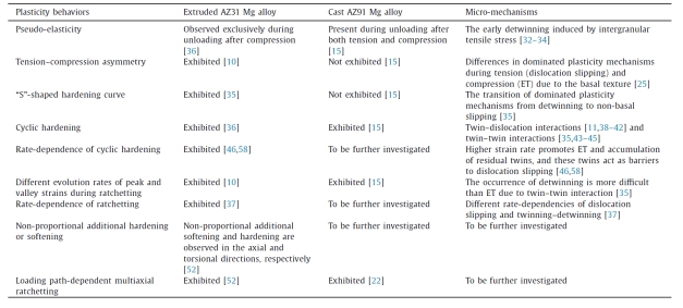 在循环塑性行为方面,论文系统总结了镁合金在单轴及多轴循环载荷下独特的伪弹性、拉-压不对称性、“S”型硬化曲线及棘轮效应等(如表1所示)。通过实验观测与分子动力学、晶体塑性有限元、相场方法等多尺度模拟手段,揭示了位错滑移与孪生/解孪的交互作用以及织构等因素对宏观塑性的调控机制。这些发现为构建本构模型提供了数据和机理支持。