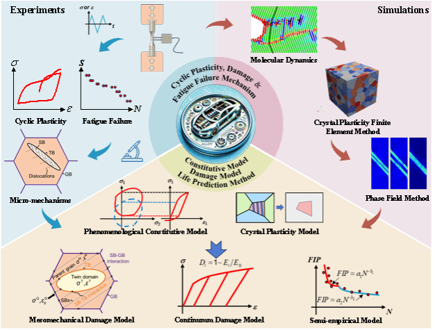 镁合金构件(如汽车轮毂、航空发动机部件)在交变载荷下易发生疲劳失效,而其独特的孪生/解孪与位错滑移交互作用,导致高度非线性的循环塑性行为和复杂的疲劳失效行为。论文深入探讨了由实验和数值模拟揭示的镁合金宏观力学行为与细观变形、损伤机制之间关联机制,进而总结了相关的循环塑性本构模型、损伤模型和寿命预测方法研究进展(如图2所示)。