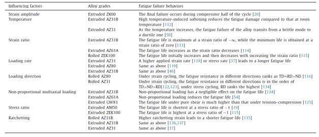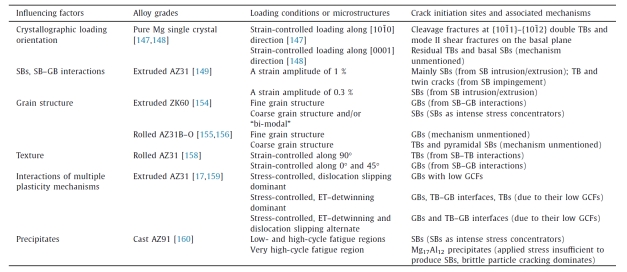 针对疲劳失效这一核心问题,论文梳理了已有实验研究揭示的加载方式(应变或应力控制)、载荷幅值、应变比(或应力比)、加载速率、加载方向和路径、环境温度等宏观服役条件对镁合金疲劳寿命和损伤演化的影响(如表2所示),并进一步总结了微裂纹萌生(滑移带-孪晶界/晶界交互作用引发的应力集中,如表3所示)和微孔洞萌生(高温棘轮变形诱导的析出相断裂)机制。结合晶体塑性模拟和分子动力学模拟,量化了织构、晶粒尺寸及加载条件对微裂纹萌生与扩展的影响。这些研究成果为疲劳寿命预测和材料优化设计提供了跨尺度的物理基础。