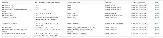 在理论建模方面,论文分类总结了宏观唯象本构模型(如基于改进的von Mises或C-P-B屈服准则的本构模型)和晶体塑性本构模型(如考虑孪生/解孪机制的TDT模型)的优势与局限。在疲劳寿命预测方面,论文系统梳理了半经验模型(包括基于应变准则和能量准则的模型,如表4所示)和基于损伤力学的模型(包括连续损伤模型和细观损伤模型)的发展历程、基本假设、应用场景及其局限性,为镁合金工程结构的安全评估和合理设计提供了重要参考。