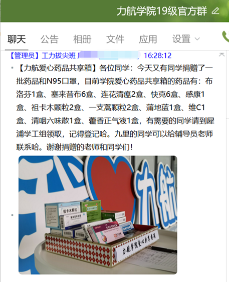 收到药物后,学院学生工作组老师们立即将药品信息在全院本、硕、博年级群里发布,戏称自己是“神雕大侠”的学院党委副书记将药品汇集起来后,在办公室门口设立了一个爱心药品共享药箱,连续多日给前来领药的师生们分发药品。他还开车多次到九里校区送去急需药品,然后由九里校区辅导员老师和学生骨干们分发给生病的同学们。
