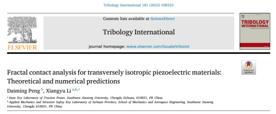 近日,摩擦学领域期刊《Tribology International》(中科院一区TOP,IF:5.62)在线发表了题为“Fractal contact analysis for transversely isotropic piezoelectric materials: Theoretical and numerical predictions”的研究成果。博士研究生彭代铭为论文第一作者,李翔宇教授为通讯作者。