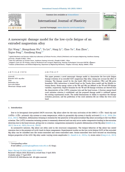 博士生王子仪在塑性力学领域顶刊《International Journal of Plasticity》上发表了题为“A mesoscopic damage model for the low-cycle fatigue of anextruded magnesium alloy”的研究成果。康国政教授为通讯作者,合作者包括于超教授、吴圣川研究员、清华大学航天航空学院冯西桥教授、新加坡南洋理工大学周琨教授、北京大学工学院李航博士后和素人AV