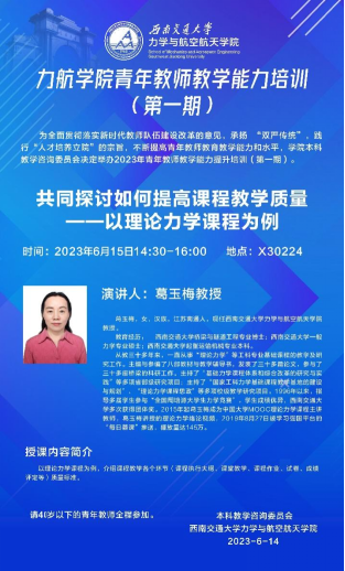 为全面贯彻落实新时代教师队伍建设改革的意见,承扬 “双严传统”,践行“人才培养立院”的宗旨,不断提高青年教师教育教学能力和水平,学院本科教学咨询委员会经过认真筹划,决定组织“青年教师教学能力培训”系列活动。首期培训活动于2023年6月15日下午在X30224举行,由学院本科教学咨询委员会委员葛玉梅教授担任主讲人,学院全体青年教师参加了培训活动。