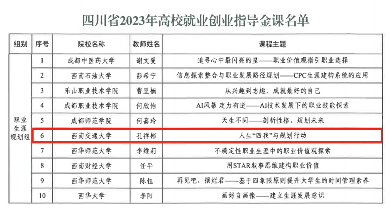 孔祥彬老师所授课程《人生‘四我’与规划行动》获评为职业生涯规划类金课。
