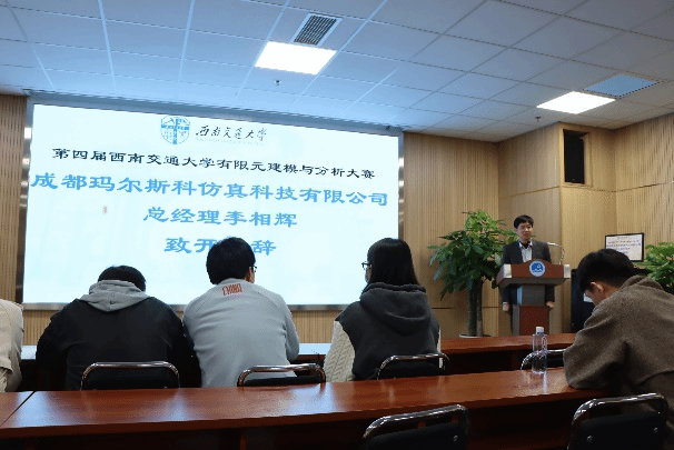 副院长阚前华教授主持,成都玛尔斯科仿真科技有限公司李相辉经理、张娟副教授、强斌副教授、王小萌副教授、许阳光副教授、王恋舟副教授、王蕉助理教授、胡雅楠助理教授、禾海伶助理教授出席了颁奖典礼。成都玛尔斯科仿真科技有限公司李相辉经理受邀致开幕辞(图3),他表示比赛的选题切合实际,富有工程意义,对锻炼同学们的科研能力和解决工程实际问题的能力有重要意义;另外李相辉经理对同学们积极参赛的态度和优秀的表现给予了赞扬与肯定,同时对参赛作品中显露出的不足之处给予了客观的评价,敦促同学们严谨细心,保持学习心态,持续进步!随后,在热烈的掌声中,评委老师依次为获奖同学颁奖并合影留念。
