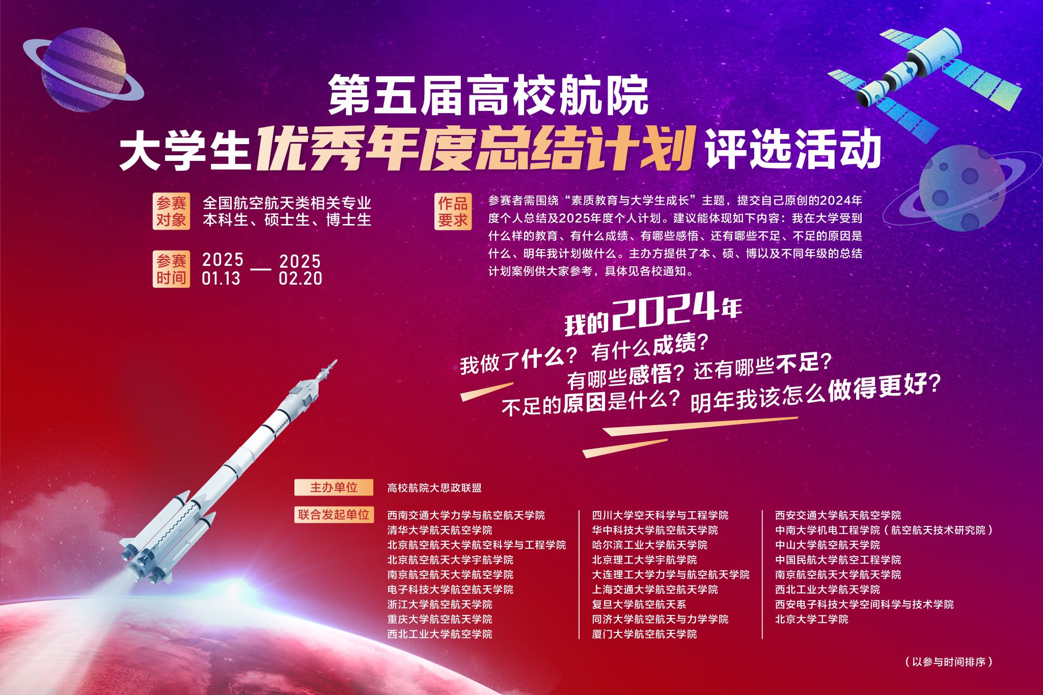 参赛者需提交自己原创的2024年度个人总结及2025年度个人计划。建议能体现如下内容:我在大学受到什么样的教育、有什么成绩、有哪些感悟、还有哪些不足、不足的原因是什么、明年我计划做什么。主办方提供了本、硕、博以及不同年级的总结计划案例供大家参考(请在‘西南交大素人AV
