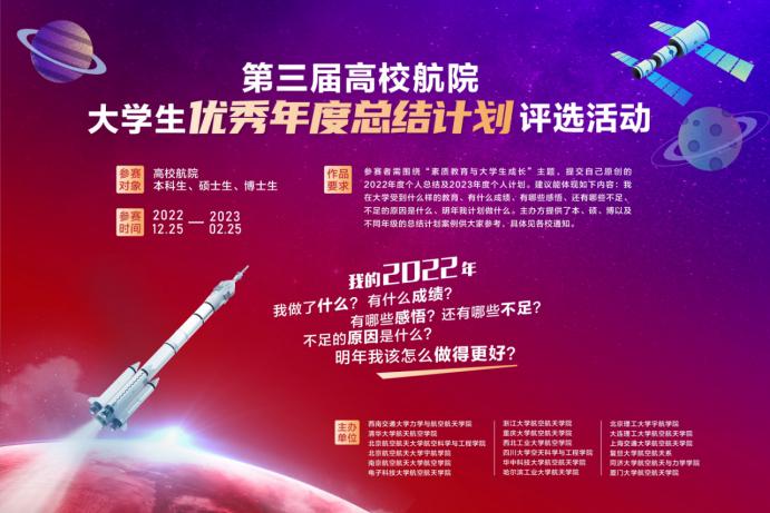 、清华大学、北京航空航天大学、南京航空航天大学、电子科技大学、浙江大学、重庆大学、西北工业大学、四川大学、华中科技大学、哈尔滨工业大学、北京理工大学、大连理工大学、上海交通大学、复旦大学、同济大学、厦门大学等17所高校航空航天相关学院联合举办的第三届高校航院大学生优秀年度总结计划评选活动成功举行。
