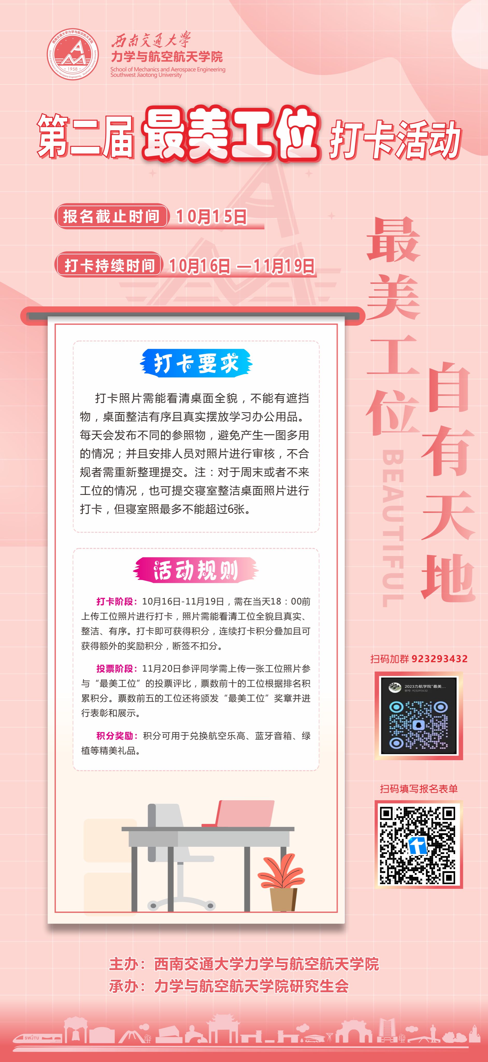 1.报名阶段:10月12-15日,请有意参加的同学填写在线表单:【腾讯文档】最美工位 自有天地 //docs.qq.com/form/page/DTk5Gc1lNQXNvamtR ;同时方便后续活动事宜通知,添加QQ群:923293432