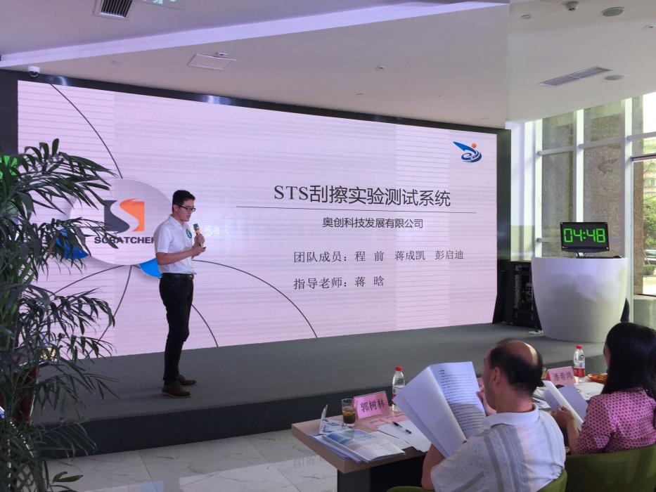 三位研究生程前、蒋成凯和彭启迪组队,蒋晗教授指导的“奥创科技发展有限公司”项目进入了最后的决赛环节。该项目源于蒋晗老师团队多年科研成果的提炼,内容是高分子材料表面刮擦设备的开发和研制。经过激烈的现场答辩,该项目在此次比赛中荣获一等奖,获得优先入驻四川省大学生创新创业中心孵化器的PASS卡。同时,该项目也获得成都1798创投基金CEO郭树林先生的肯定和青睐,并在答辩会现场签订了200万的意向投资协议。