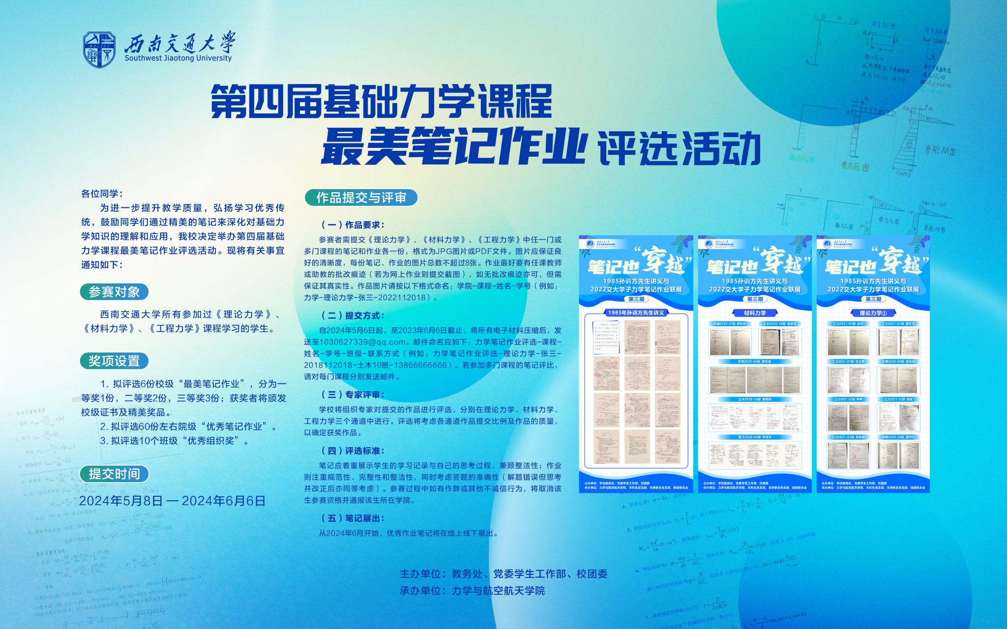 (二)提交方式:自2024年5月8日起,至2023年6月6日截止。将所有电子材料压缩后,发送至[email protected]。邮件命名应如下:力学笔记作业评选-课程-姓名-学号-班级-联系方式(例如:力学笔记作业评选-理论力学-张三-2018112018-土木10班-13866666666)。若参加多门课程的笔记评比,请对每门课程分别发送邮件。