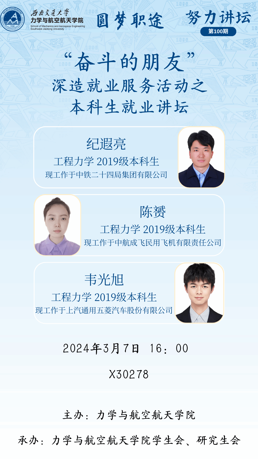 三位院友现身说法,结合在中铁二十四局、成飞民机、五菱的工作经历,从心态调整、简历制作、面试技巧、职业规划、未来打算等多个方面开展分享。此外,陈赟从HR的角度解释了工作能力的需求,纪遐亮分享了岗位前景和个人规划,韦光旭提出要正确、勇敢地展视自己的闪光点。
