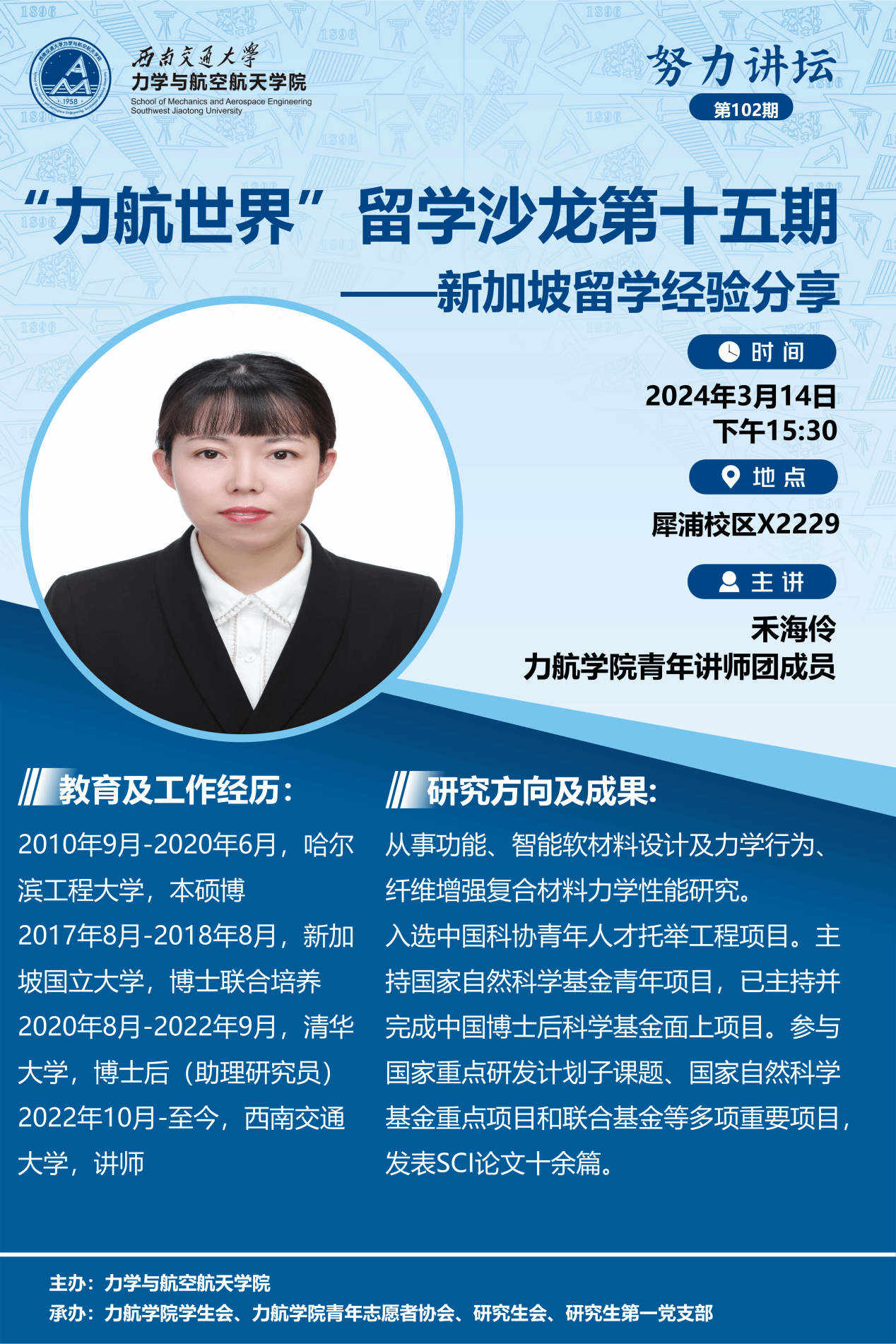 任教。本次活动,禾海伶老师以“新加坡求学经历分享”为题,主要从留学动机、新加坡介绍、新加坡国立大学介绍和留学申请流程等方面进行了分享。