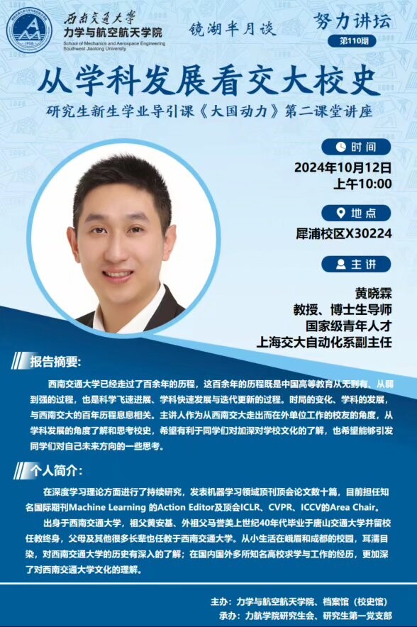 2024级研究生新生学业导引课《大国动力》第二课堂讲座在X30224教室隆重举行。此次讲座特邀上海交通大学自动化系副主任、博士生导师、国家青年人才黄晓霖教授主讲,以“从学科角度看校史”为主题展开。档案馆许金砖副馆长、学院党委副书记孔祥彬、辅导员安晟斐及学院2024级全体研究生出席了此次活动,现场气氛热烈,掌声不断。