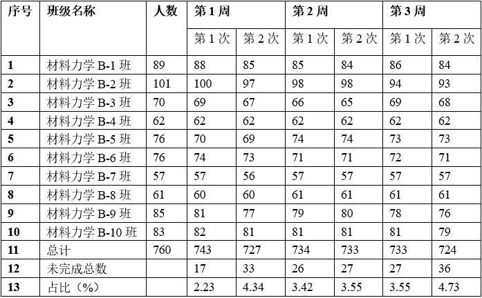 最后,龚晖教授报告了SOTS后台记录的前三周学生学习材料力学的大数据反馈结果(如表1和表2所示),2149名学生中约有95%的同学能够很好地完成任课教师发布的学习任务(包括教学视频和网上作业)。材力AII没有完成学习任务的学生人数最多一次为78人,占5.61%;材力B没有完成学习任务的学生人数最多一次为36人,占4.73%。二者之和最多为114人,这与开课之初统计到的100名左右没有在线学习条件的学生人数具有一定的相关性。以上数据表明,在全体材料力学课程团队成员的努力下,线上授课运行秩序和效果良好。此外,有相当多的学生表示SOTS平台的学习效果优于其他线上教学平台,表明素人AV