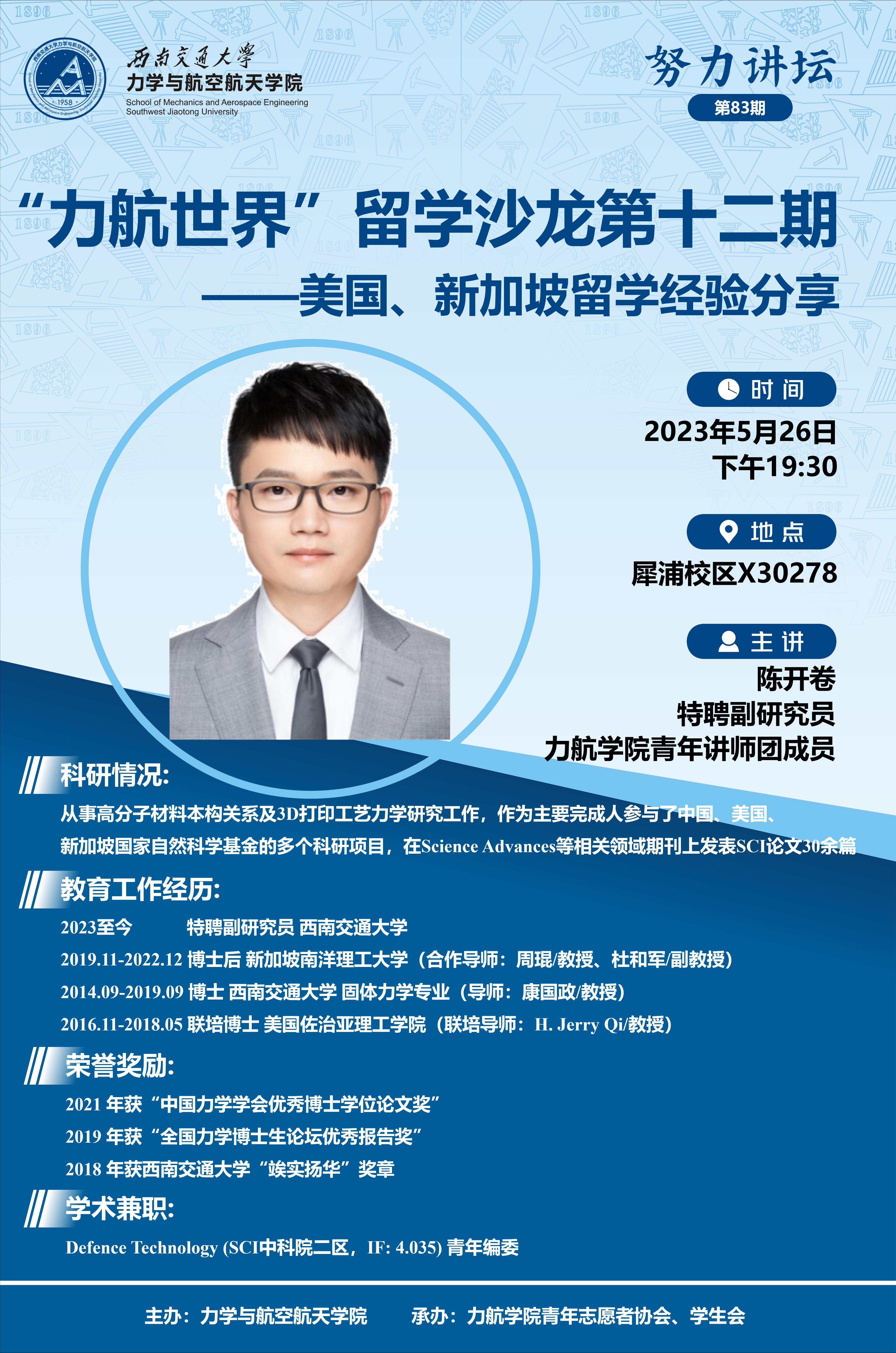 任教。本次活动,陈开卷老师以“美国及新加坡留学经验分享”为题,主要从科研心得、留学生活等方面进行分享。