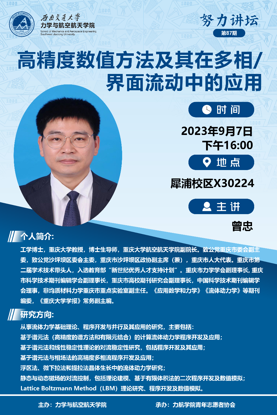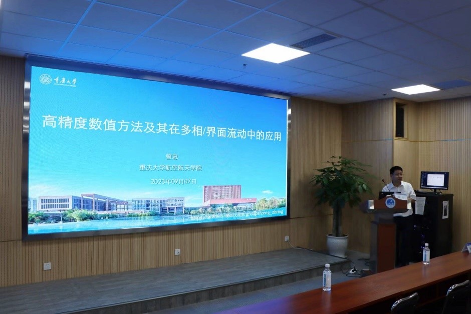 9月7日下午16:00,在X30224,重庆大学航空航天学院副院长曾忠教授以“高精度数值方法及其再多相/界面流动中的应用”为主题为素人AV 学生作了主题报告。素人AV 副院长阚前华、副院长李鹏及学院青年老师们出席报告,学院60余名同学参加本次活动。