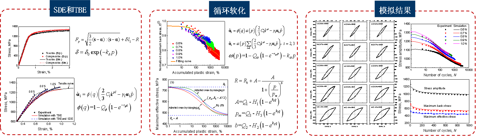 鉴于无碳化物贝氏钢轨材料的循环变形行为与传统珠光体钢轨材料有着明显的区别,为了评估贝氏体钢轨的循环塑性特性,基于广义塑性理论,提出了一个新的循环塑性本构模型。在该模型中,采用了修正的Drager-Prager屈服函数来考虑拉压非对称性,引入应变幅相关系数来考虑瞬间包辛格效应,构建了新的各向同性硬化和随动硬化函数来精确描述循环过程循环软化。该模型精确预测了无碳化物贝氏体钢轨应变幅相关的循环软化特性、拉压非对称性和瞬态包辛格效应。