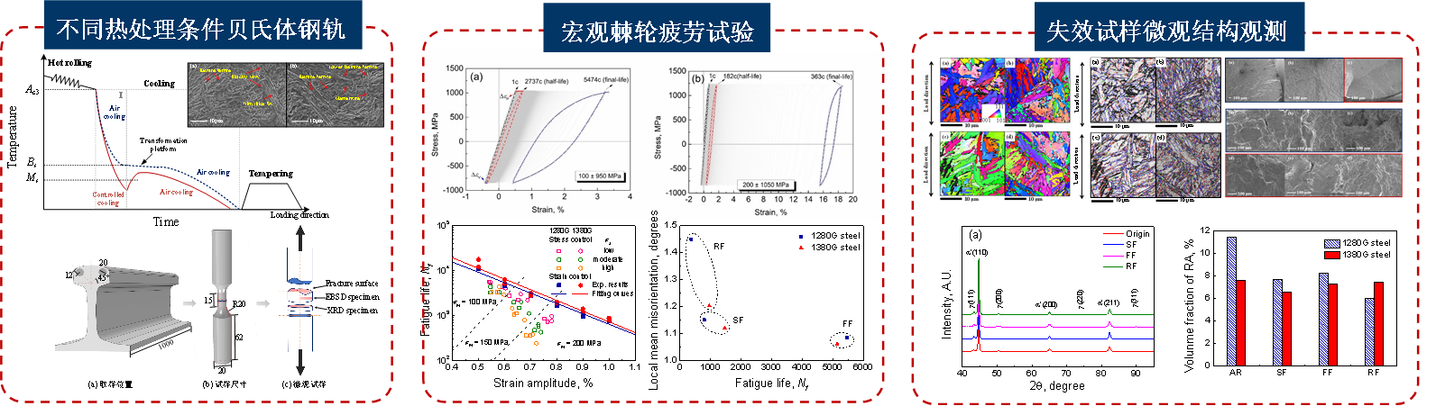 阚前华教授课题组针对两种不同热处理条件下的无碳化物贝氏钢轨钢开展了应变疲劳和应力疲劳试验,分别从宏、微观层面研究了微结构和残余奥氏体对棘轮疲劳交互作用的影响。结果表明无碳化物贝氏呈现出非饱和的应变幅相关的循环软化特性,稳定位错子结构的形成和块状残余奥氏体的转变促进了棘轮变形的演化。