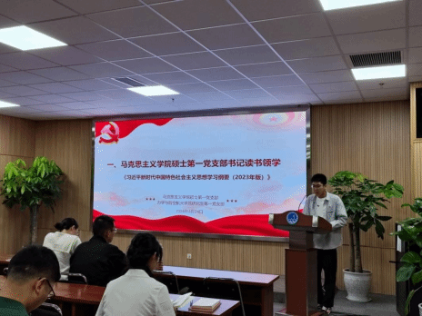 首先,马克思主义学院硕士第一党支部书记肖云峰同志进行领学,他分享了《习近平新时代中国特色社会主义思想学习纲要》中的部分重要观点,并联系实际学习、工作、生活做了发言。