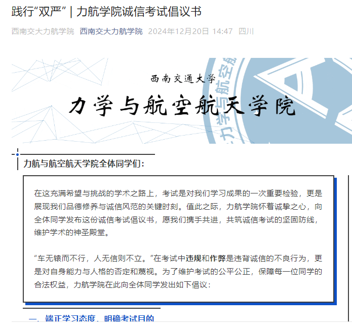 本科生党支部发布诚信考试倡议书,提出:1.端正学习态度,明确考试目的;2.认真复习备考,实力铸就自信;3.遵守考试纪律,维护考场秩序;4.弘扬诚信精神,树立良好榜样等四点倡议。希望党员同志与全体同学携手共进,共筑诚信考试的坚固防线,维护学术的神圣殿堂。