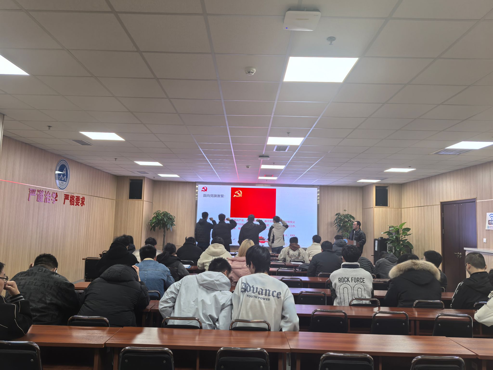 最后,支部开展了接受预备党员的大会。本次大会应到正式党员43人,实到30人,超过正式党员人数的2/3,本次接受预备党员大会有效。丰继佐同志介绍了黄鑫睿、钟卫民、谢帅奥、李自强等4名同志的基本情况。这4名发展对象依次进行了表态发言。然后,由张吉鼎和赵可可两位党支部委员分别对这些同学进行了思想考察评价,同意接受这些同志为预备党员。