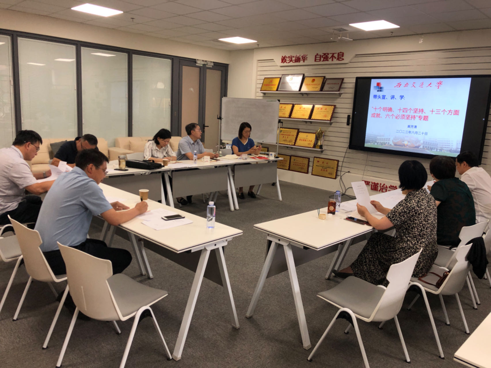 6月20日上午,根据学院主题教育方案统一部署,学院党委组织领导班子、党委委员在30278会议室围绕“十个明确”“十四个坚持”“十三个方面成就”“六个必须坚持”专题展开了学习。本次学习由学院副院长高芳清领学。