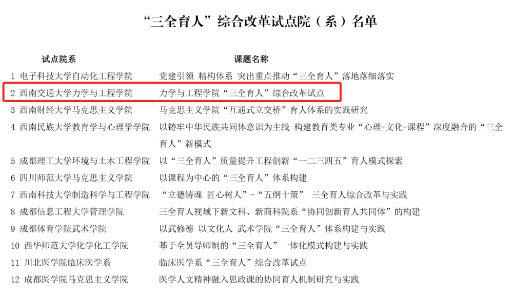 获批国家级一流课程 6 门、四川省课程思政示范课 2 门、四川省课程思政示范团队 1 个,1 门课程连续4 学期入选校最受欢迎选修课,多位教师受邀在全国基础力学教学交流会、高校在线开放课程建设应用推进会、中国教与学学术国际会议等会议做相关报告 20 余次,获评高等教育出版社力学课程报告论坛特别贡献奖。
