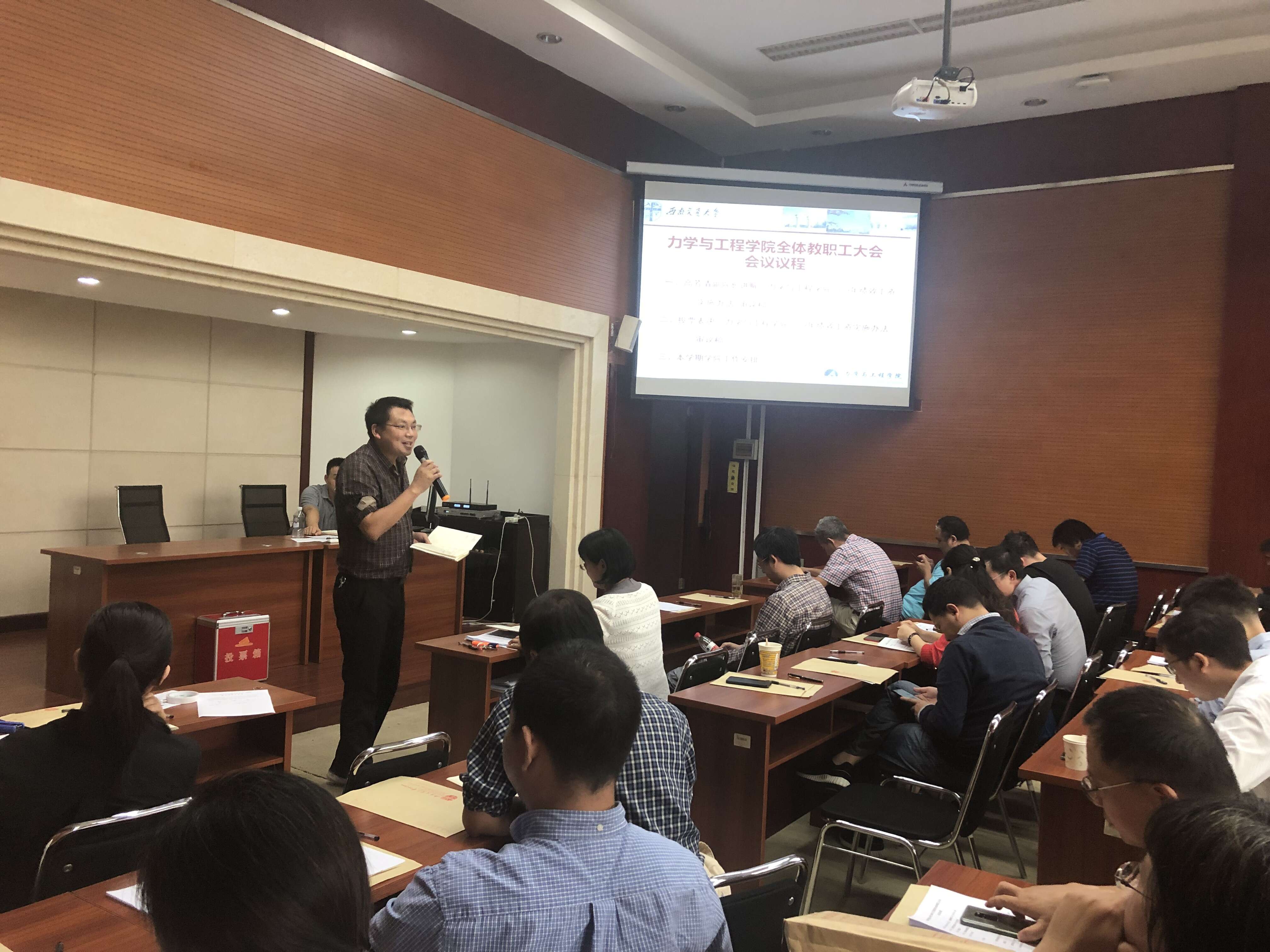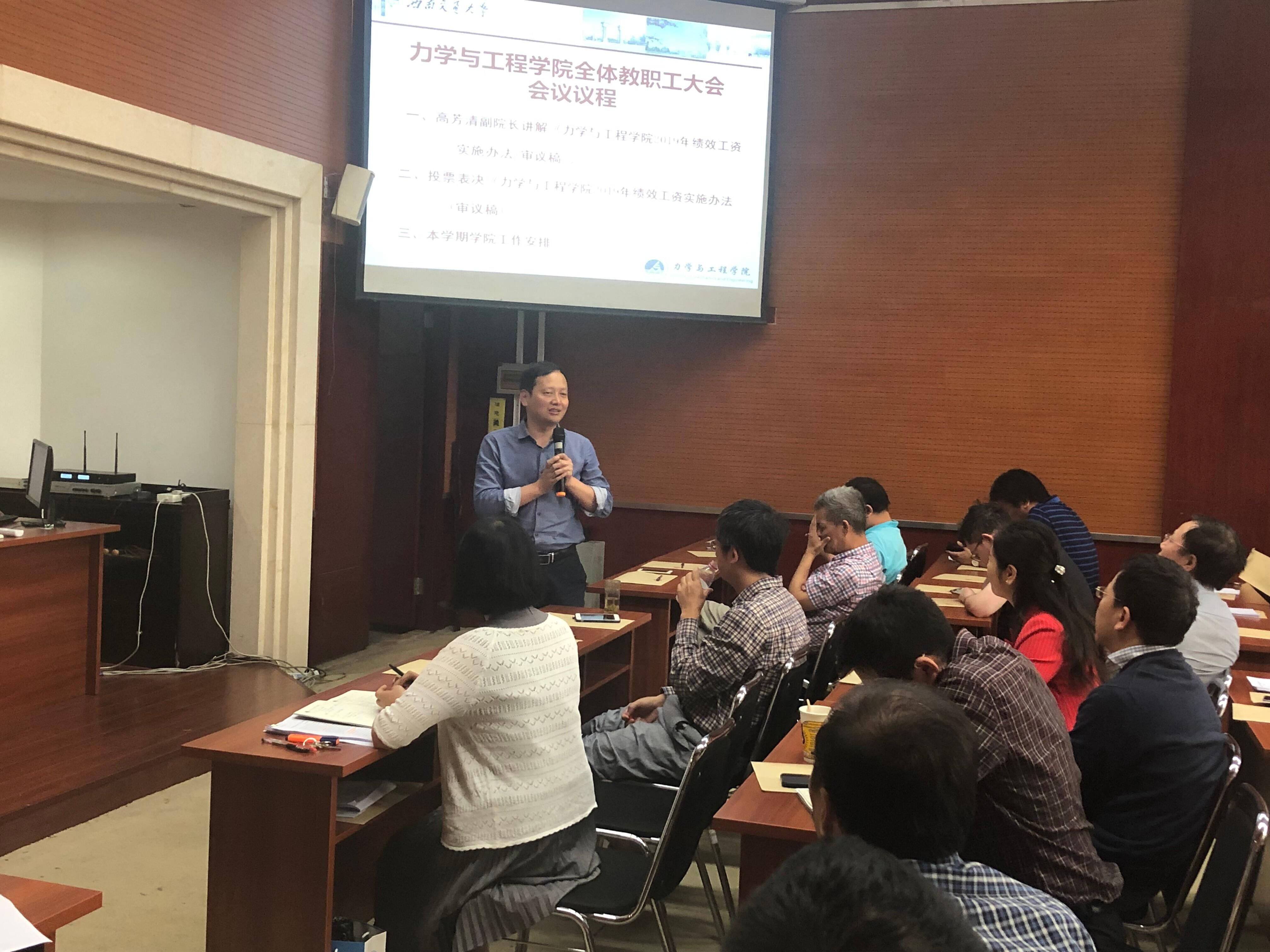 力学与工程学院2019—2020学年第一学期第一次全体教职工大会于9月5日14:30在九里校区1号综合楼240学术会议厅召开。学院全体教职工参加了本次会议。会议由学院党委书记栗民主持。
