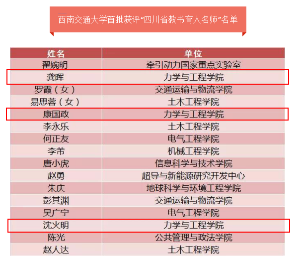 9月9日,中共四川省委教育工作委员会、四川省教育厅公布首批四川省教书育人名师名单,经四川省教育厅面向全省各级各类学校遴选和认定,力学学院沈火明、康国政、龚晖3名教师获评该称号。