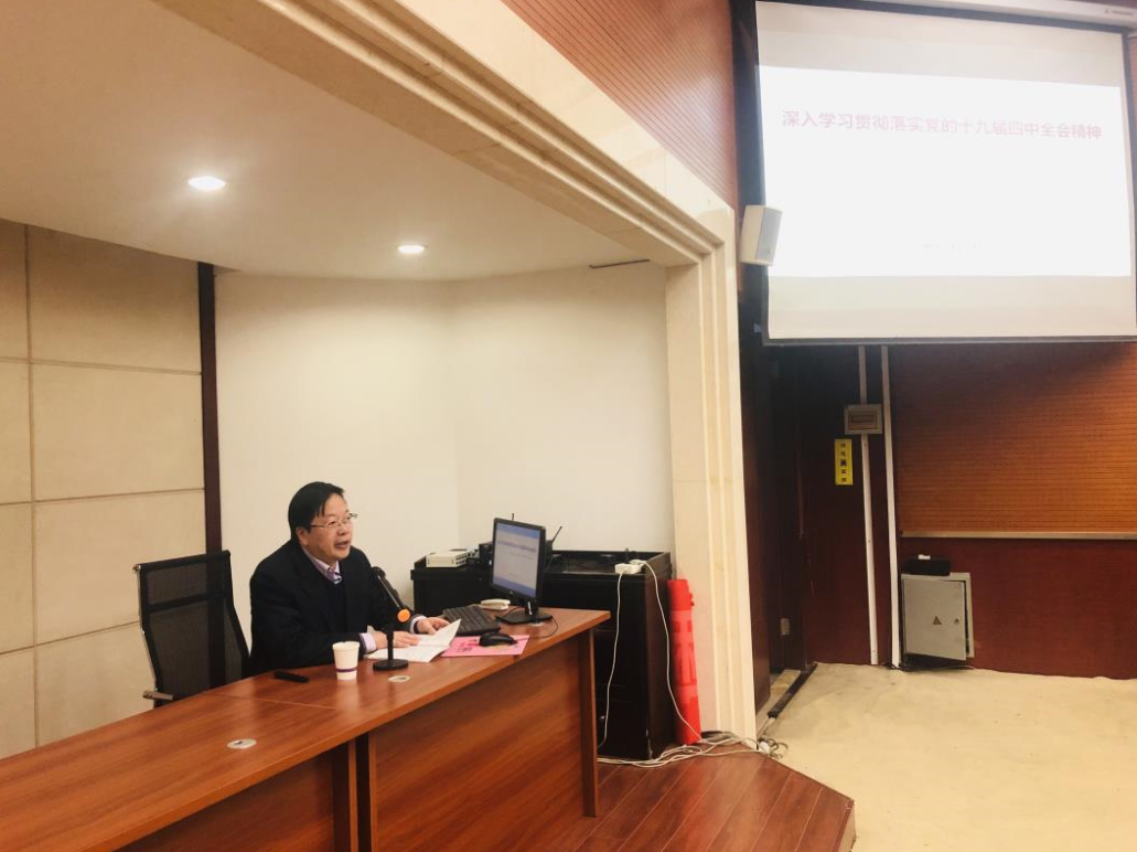 2019年12月12日下午16:30,在九里校区1号综合楼学院240学术报告厅,校党委常委沈火明教授围绕《深入学习贯彻落实党的十九届四中全会精神》,为力学与工程学院全体教职工带来了一次既高屋建瓴又接地气的专题党课。学院党委书记栗民、院长康国政等全院教职工参加了党课。