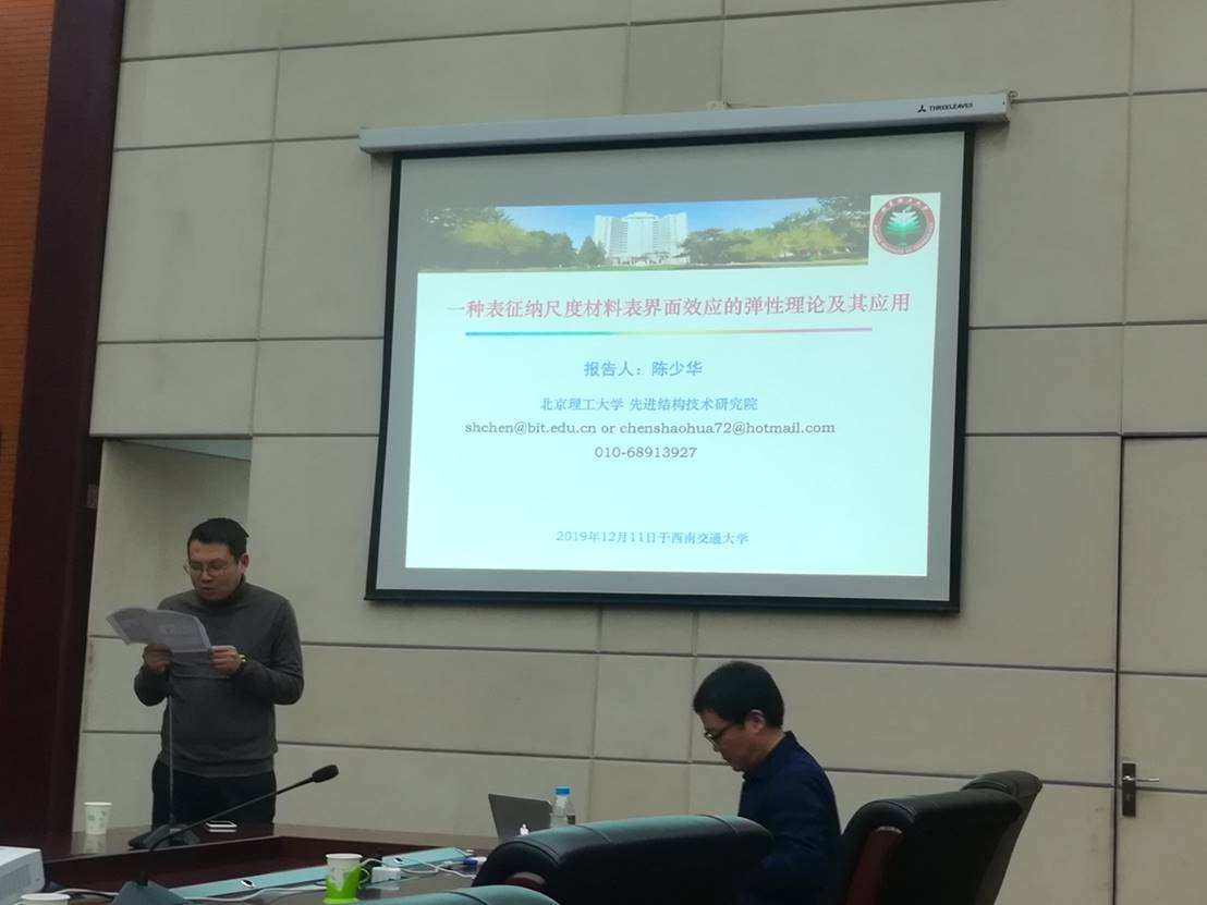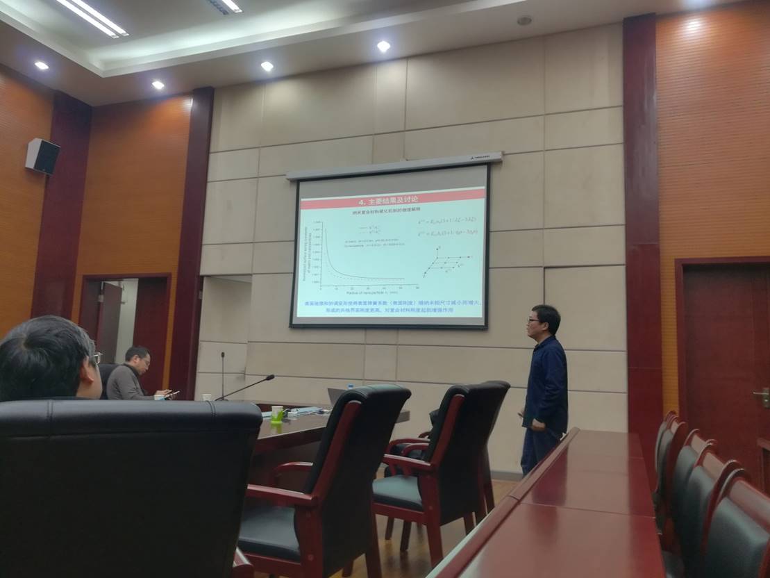报告开始,陈少华教授概括性介绍了他学术研究近二十年来的工作,主要内容包括:微纳米材料与低维材料力学,表界面接触与薄膜力学和仿生材料与结构力学。本次报告主要针对于表界面接触与薄膜力学方面的研究工作。报告中陈教授讲述到,宏观体材料及微观尺度材料相比,纳尺度材料具有较大的比表面积(表面积/体积之比),且随材料特征尺寸(例如,纳米球直径、纳米板厚度)减小,表面原子的比例迅速增加,表面原子对纳米材料整体力学性能的影响进一步增强,纳尺度材料的物性表现出明显的尺寸相关性,即纳尺度材料的表/界面效应,如何在连续介质力学框架下合理表征纳尺度材料的表/界面效应,一直是研究者们关注的科学问题。在此问题上,陈教授建立了一种基于纳尺度材料表界面能密度的弹性理论模型,表征纳尺度材料的表界面效应,理论模型仅与力学、物理和材料学家熟悉的宏观材料表界面能密度、纳尺度材料表面松弛参数及界面失配参数相关,所有参数具有明确的物理意义,且易获得,进一步应用该理论模型,表征纳米薄板拉伸、纳米梁弯曲、纳米线振动、纳米压痕硬度、纳米多孔材料及纳米颗粒符合材料力学行为中的尺寸效应现象,揭示表界面效应引起的纳尺度材料软化或硬化行为的物理本质。